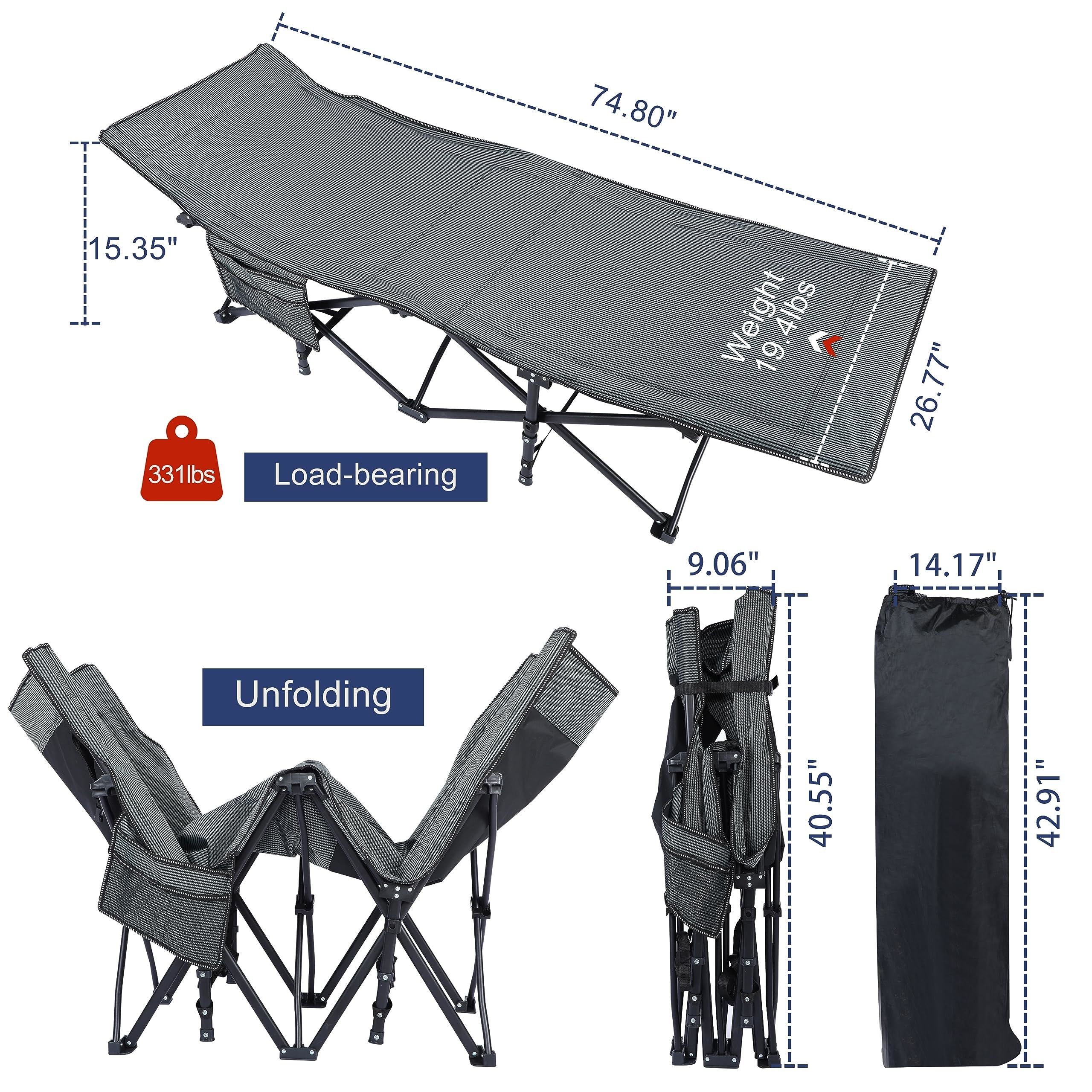 Versatile Use: Camping cot can be used not only for camping but also for other outdoor issues such as hiking, fishing, or picnics. They provide a comfortable and elevated surface to rest on, keeping you off the ground and away from dirt, insects, and moisture.