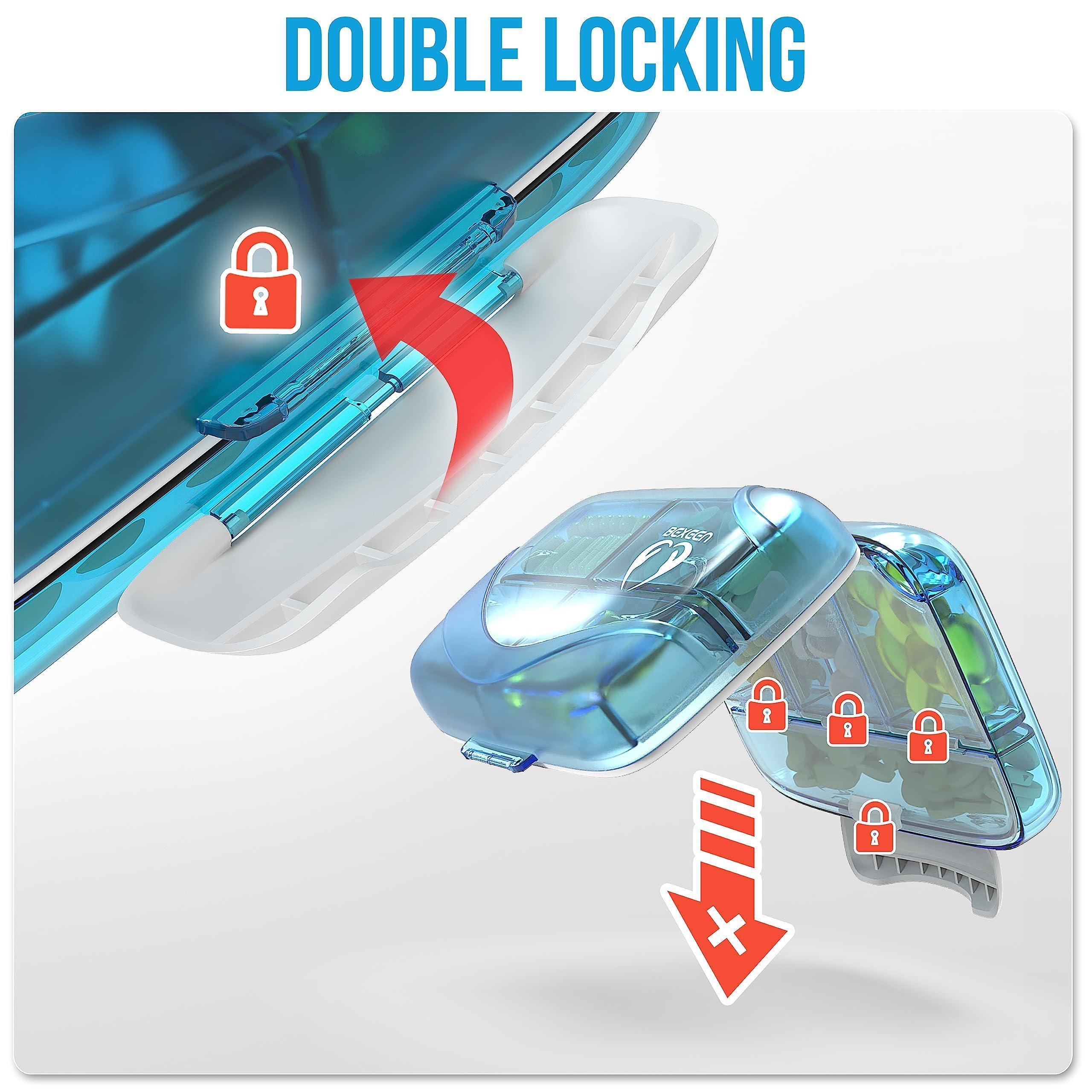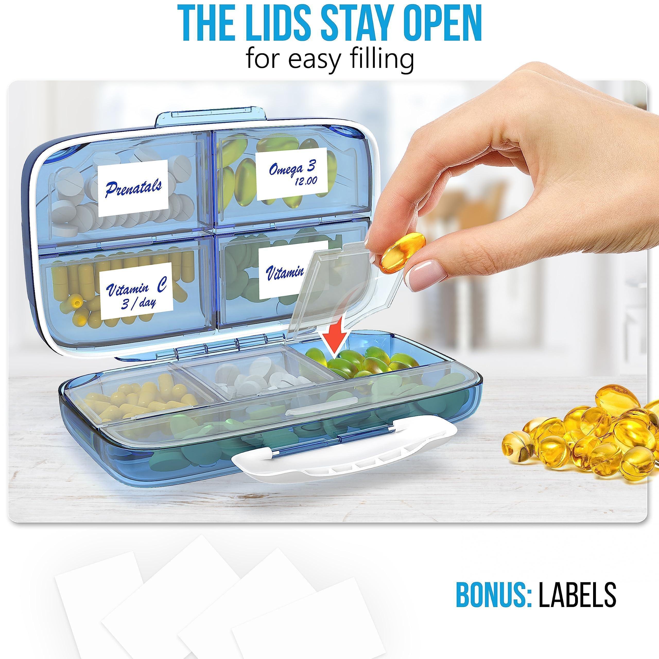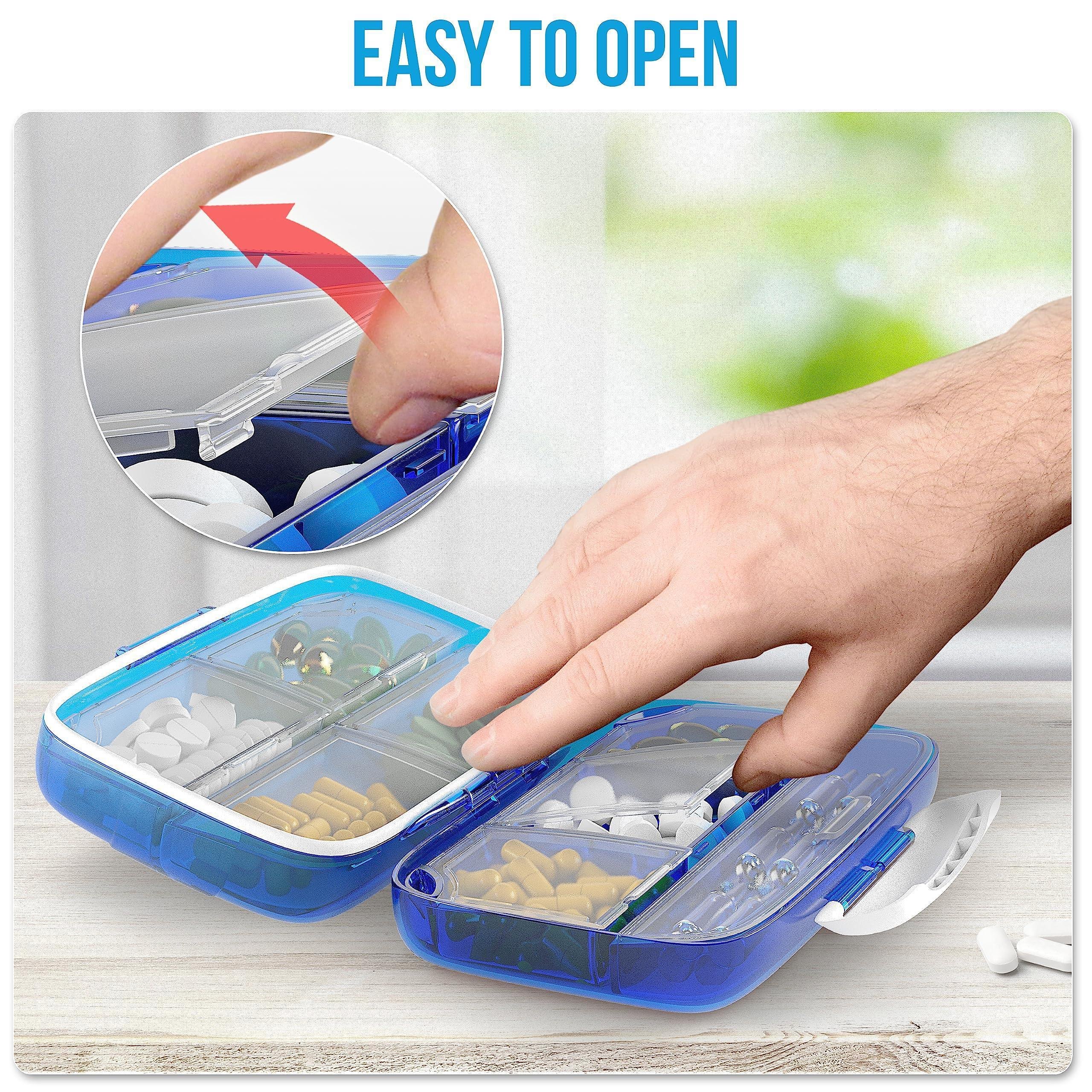 3.large box fastener and small snap joints prevent any pop-open or dump-open. easier and safer travel pill organizer