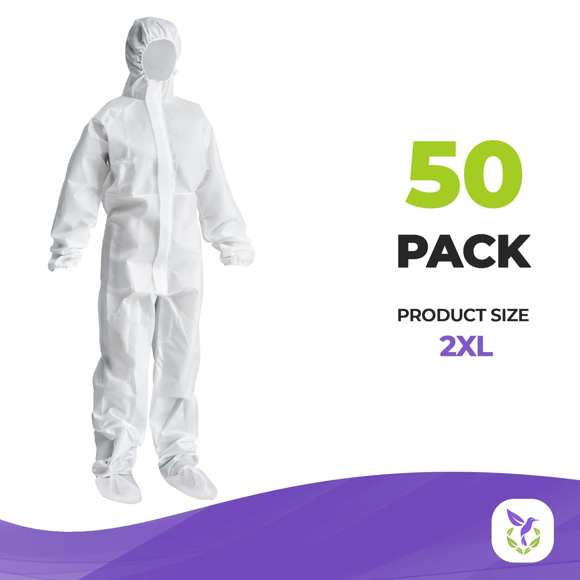 1.Pack of 50 White Disposable Coveralls with Hood, 2X-Large. Ensure your body and clothes remain clean during your work shift with this white disposable jumpsuit. It comes with a hood and boots, offering full protection for painters and maintaining cleanliness from head to toe.