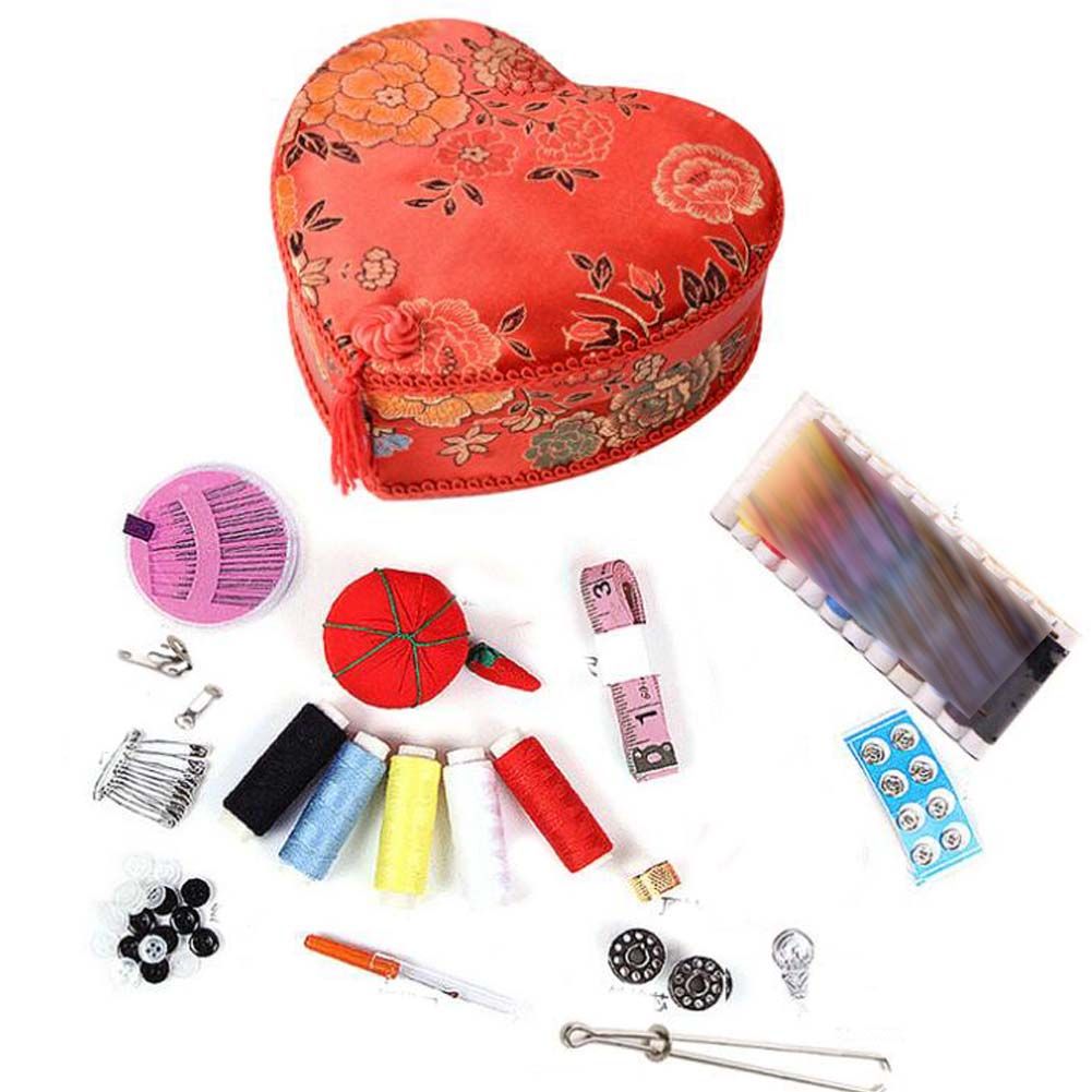 Home Sewing Kit 5 Colors Thread Spools Chinese Wedding Sewing Kit with Red Heart Shape Case, Random Pattern