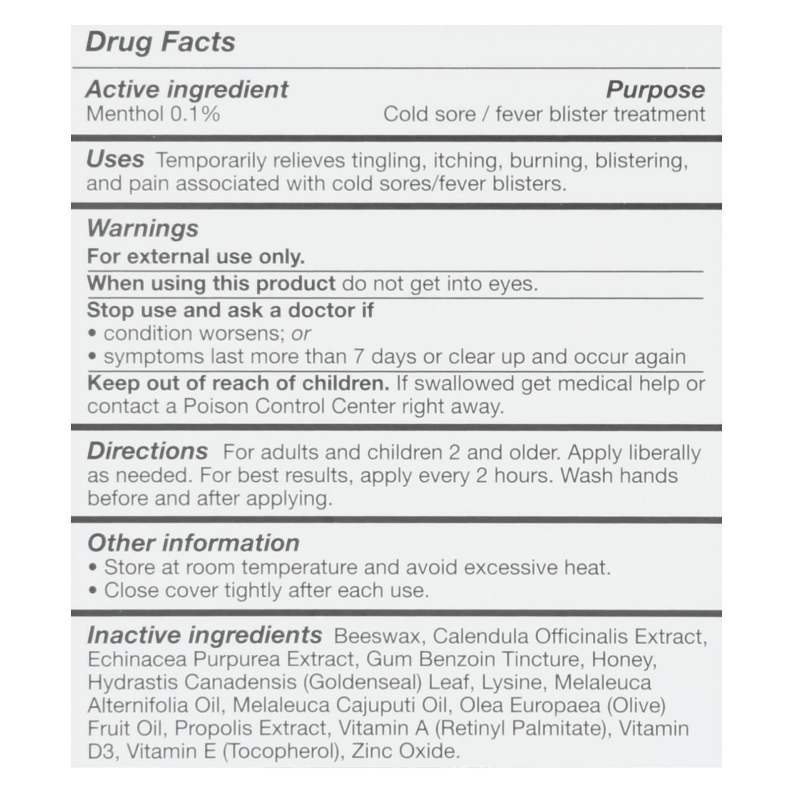 ingredients : beeswax;calendula officinalis extract;echinacea purpurea extract;gum benzoin tincture;honey;hydrastis canadensis;goldenseal;leaf;lysine;melaleuca alternifolia oil;melaleuca cajuputi oil;olea europaea;olive;fruit oil;propolis extract;vitamin a;retinyl palmitate;vitamin d3;vitamin e;tocopherol;zinc oxide;menthol 0.1% purpose cold sore / fever blister treatment