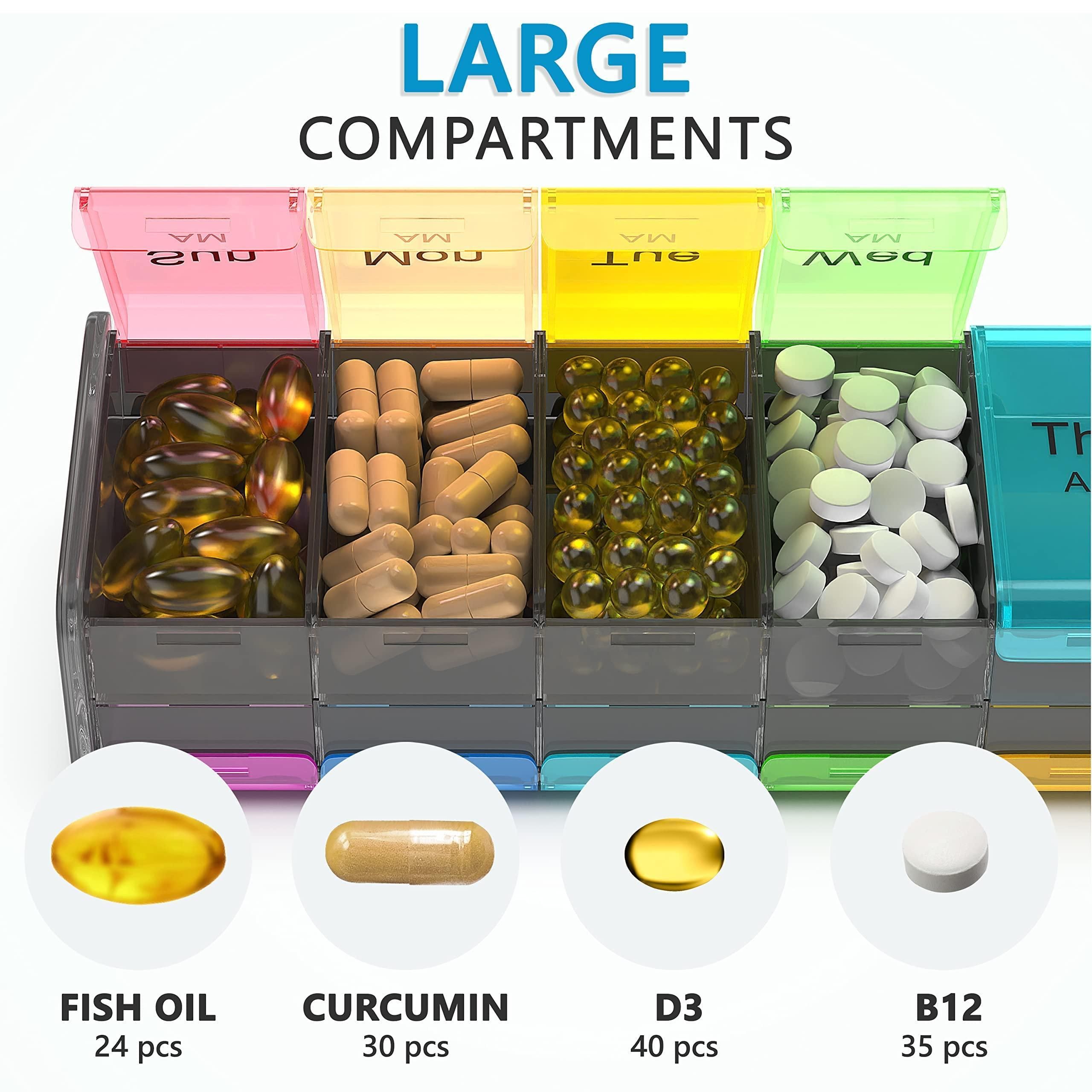 1.+50% more pills - this large pill organizer comes with compartments that are big of containing more pills than other am pm pill organizer holders. each compartment can store 24 fish oil / 30 capsules turmeric / 30 pcs - b12