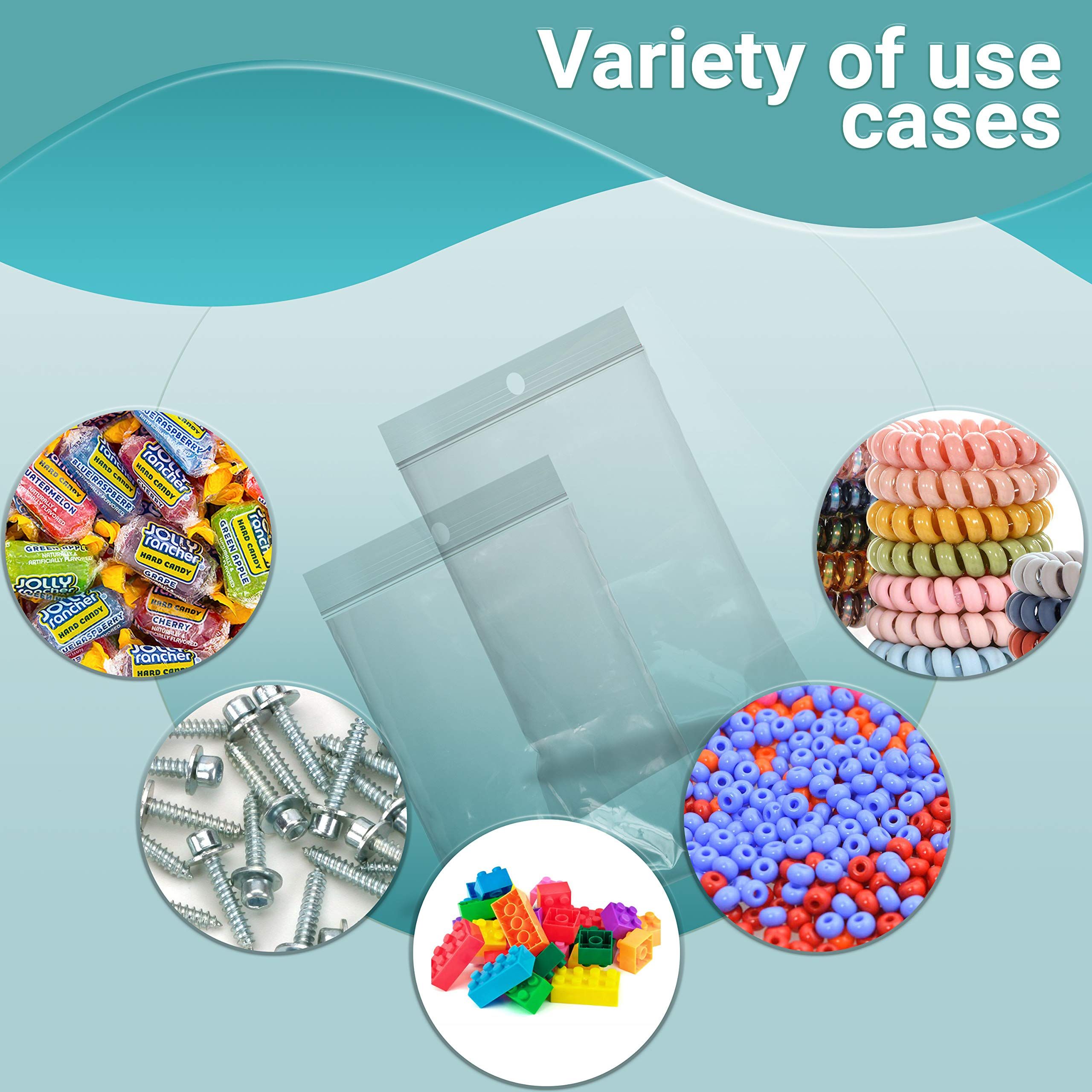 1.Pack of 500 zipper top bags with hang hole 12" W x 15" L, 4 mil thickness do not only make your products look great, they also keep them fresher longer! Their excellent strength, excellent preservation qualities and crystal-clear clarity make plastic poly bags a great choice for retail food storage and presentation. Zipper storage bags are the most commonly used plastic bag because they provide exceptional clarity for outstanding product presentation.