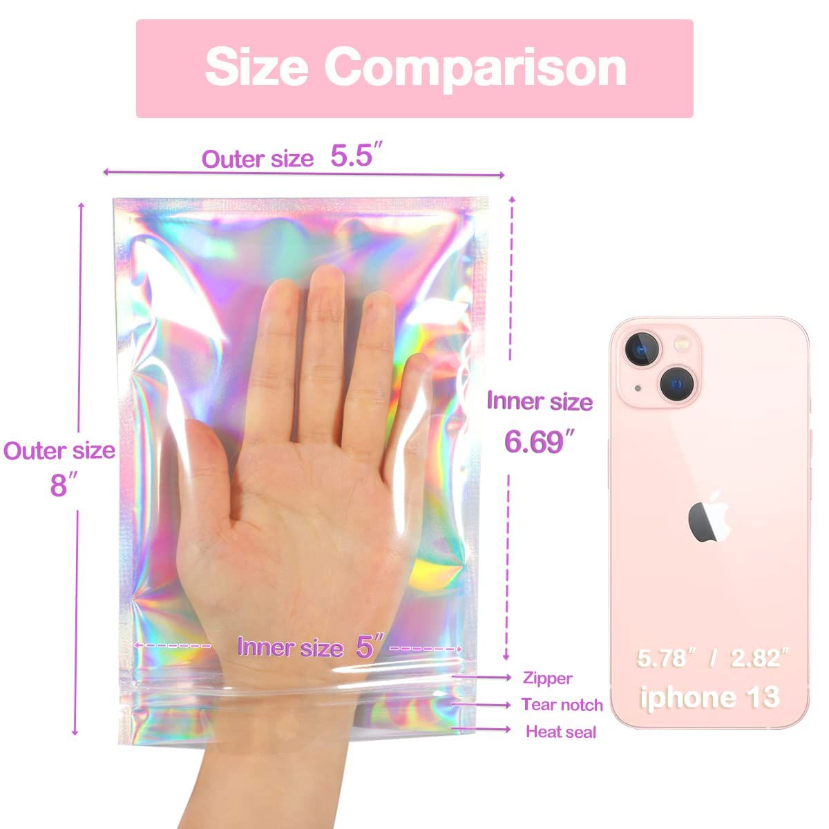 4.Holographic Smell Proof Bags With Sealing Strip & Tear Giudes - These aluminum foil bags with self sealing strip is designed to keep your items clean, safe and organized. Resealable ziplock bags are easy to seal. These resealable pouches have two tear giudes on the top, you can tear holographic bags
